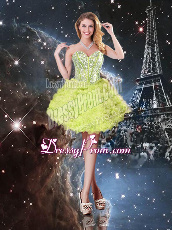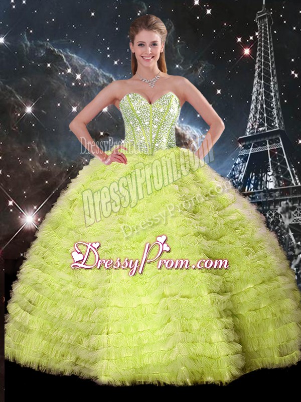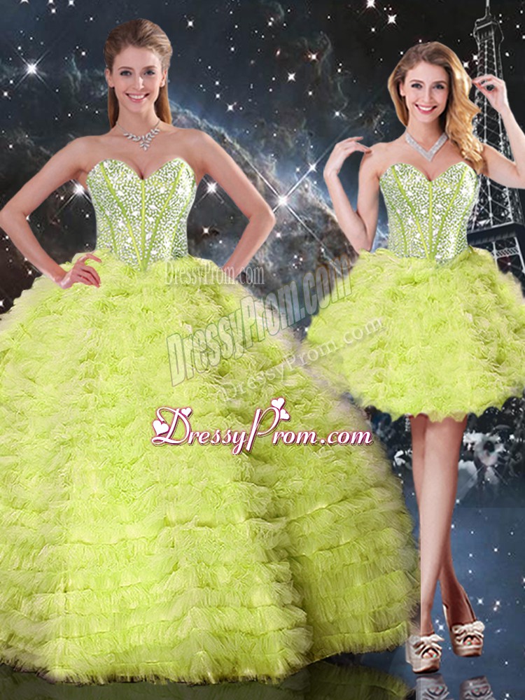 Neckline : SweetheartShown Color : Yellow GreenSilhouette : Three PiecesSleeve Length : sleevelessHemline : floor lengthBack Detail : Lace upFabric : TulleEmbellishment : Beading,RufflesOccasion : Sweet 16,QuinceaneraSeason : Spring,Summer,Fall,Winter