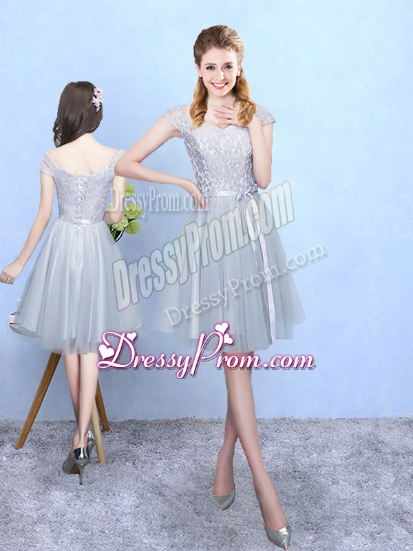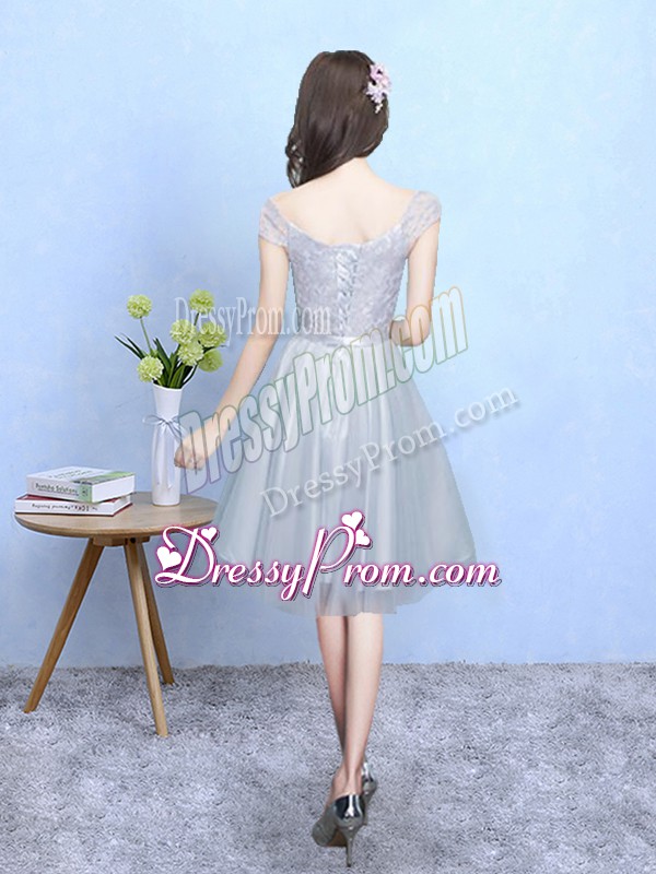 Neckline : V-neckShown Color : SilverSilhouette : EmpireSleeve Length : cap sleevesHemline : knee lengthBack Detail : Lace upFabric : TulleEmbellishment : LaceOccasion : Wedding PartySeason : Spring,Summer,Fall