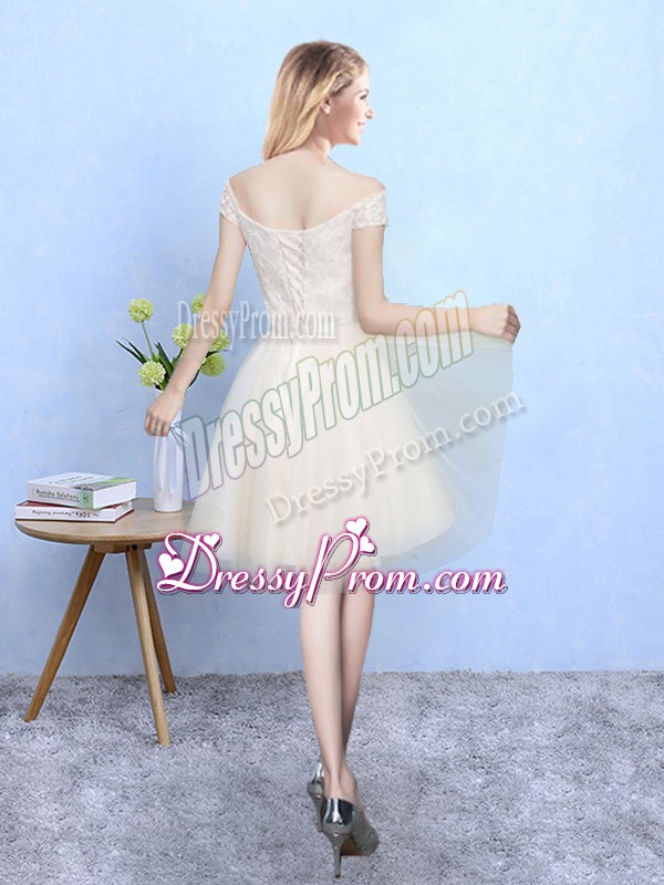 Neckline : Off the shoulder Shown Color : Champagne Silhouette : Empire Sleeve Length : cap sleeves Hemline : knee length Back Detail : Lace up Fabric : Tulle Embellishment : Lace Season : Spring,Summer,Fall