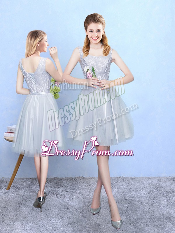 Neckline : SquareShown Color : SilverSilhouette : EmpireSleeve Length : sleevelessHemline : knee lengthBack Detail : Lace upFabric : TulleEmbellishment : LaceOccasion : Wedding PartySeason : Spring,Summer,Fall