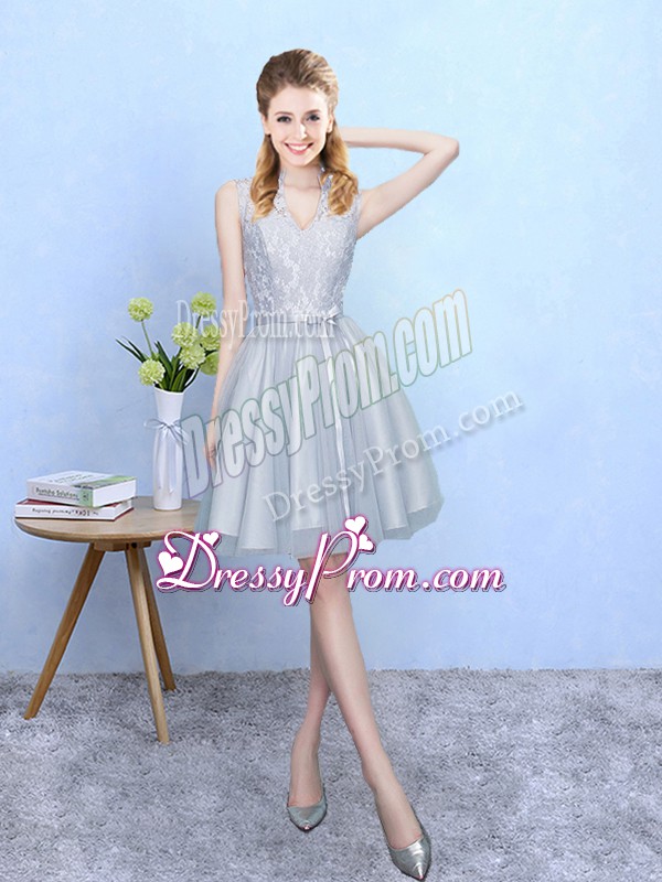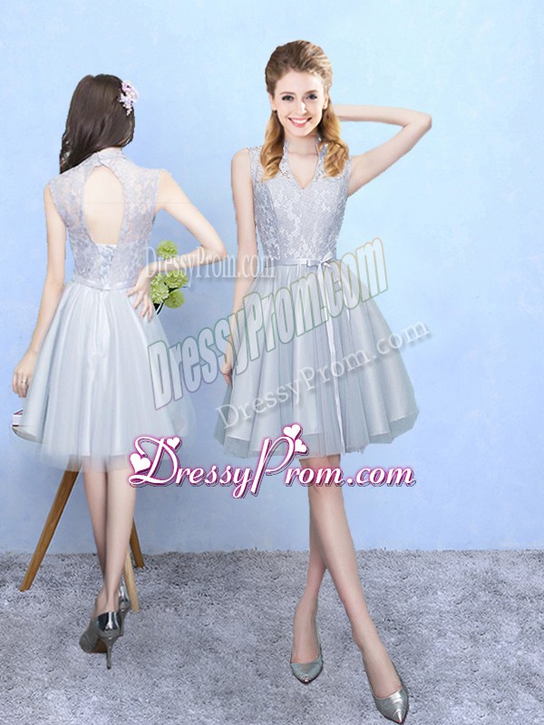Neckline : V-neckShown Color : SilverSilhouette : EmpireSleeve Length : sleevelessHemline : knee lengthBack Detail : Lace upFabric : TulleEmbellishment : LaceOccasion : Wedding PartySeason : Spring,Summer,Fall
