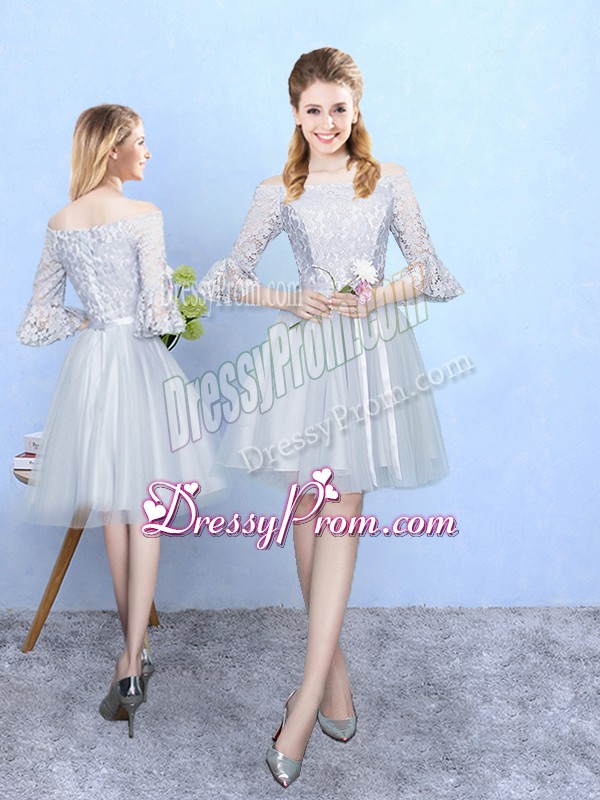 Affordable Silver Tulle Lace Up Off The Shoulder Half Sleeves With Train Quinceanera Dama Dress Lace