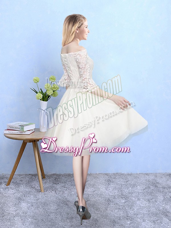 Neckline : Off the shoulderShown Color : ChampagneSilhouette : EmpireSleeve Length : half sleevesHemline : knee lengthBack Detail : Lace upFabric : TulleEmbellishment : LaceOccasion : Wedding PartySeason : Spring,Summer,Fall,Winter