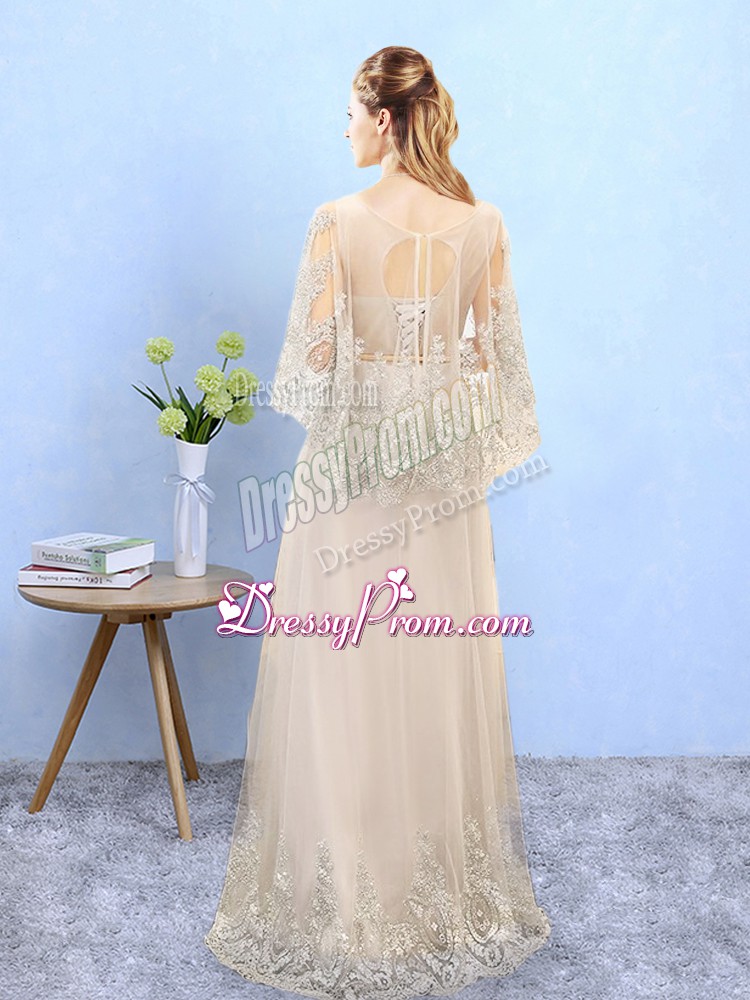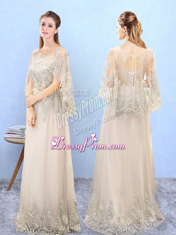 Neckline : ScoopShown Color : ChampagneSilhouette : EmpireSleeve Length : half sleevesHemline : floor lengthBack Detail : Lace upFabric : TulleEmbellishment : Beading,AppliquesSeason : Spring,Summer,Fall,Winter