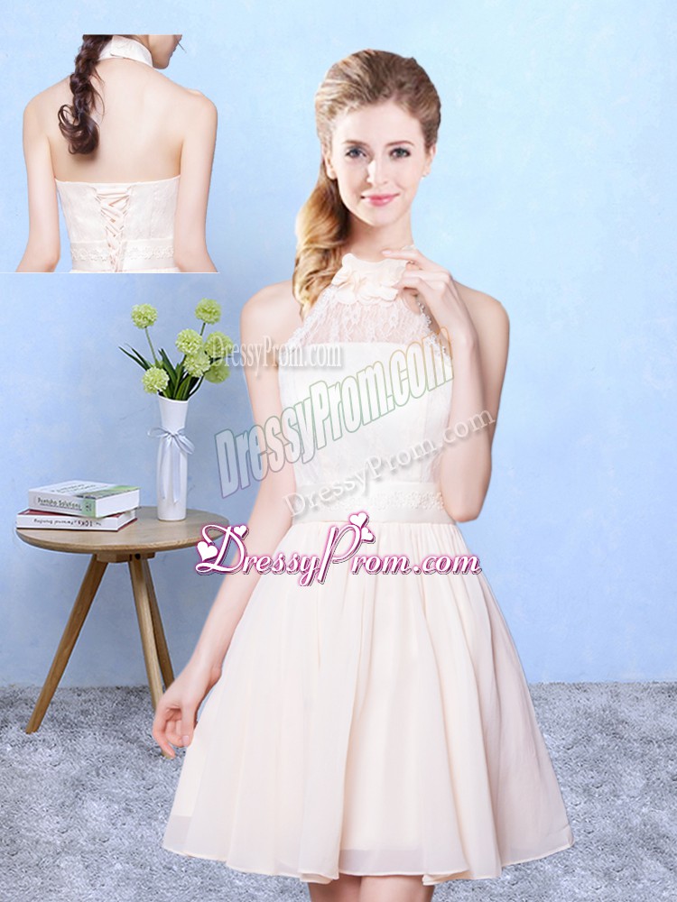 Neckline : High-neckShown Color : ChampagneSilhouette : EmpireSleeve Length : sleevelessHemline : knee lengthBack Detail : Lace upFabric : ChiffonEmbellishment : LaceOccasion : Wedding PartySeason : Spring,Summer,Fall
