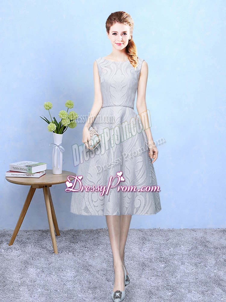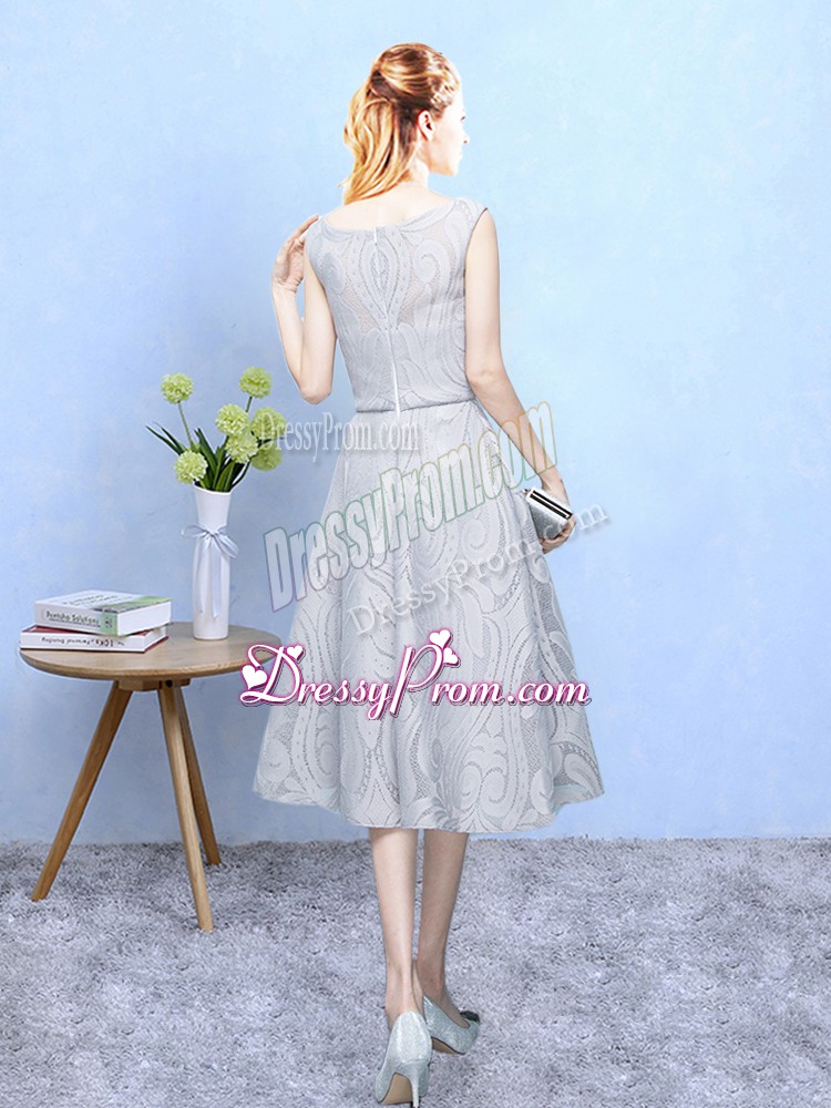 Neckline : ScoopShown Color : GreySilhouette : EmpireSleeve Length : sleevelessHemline : tea lengthBack Detail : ZipperFabric : LaceEmbellishment : LaceOccasion : Wedding PartySeason : Spring,Summer,Fall