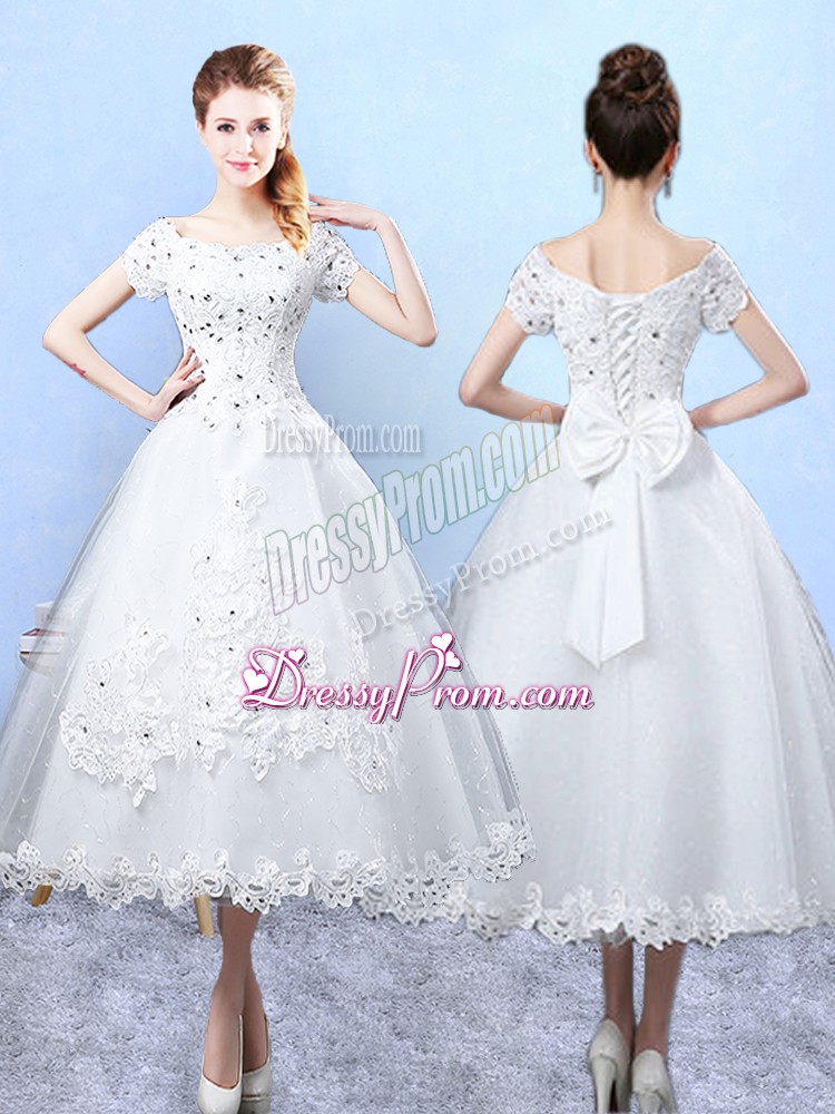 Neckline : ScoopShown Color : WhiteSilhouette : A-lineSleeve Length : short sleevesHemline : ankle lengthBack Detail : Lace upFabric : TulleEmbellishment : Beading,Lace,BowknotOccasion : Prom,Party,Wedding PartySeason : Spring,Summer,Fall,Winter
