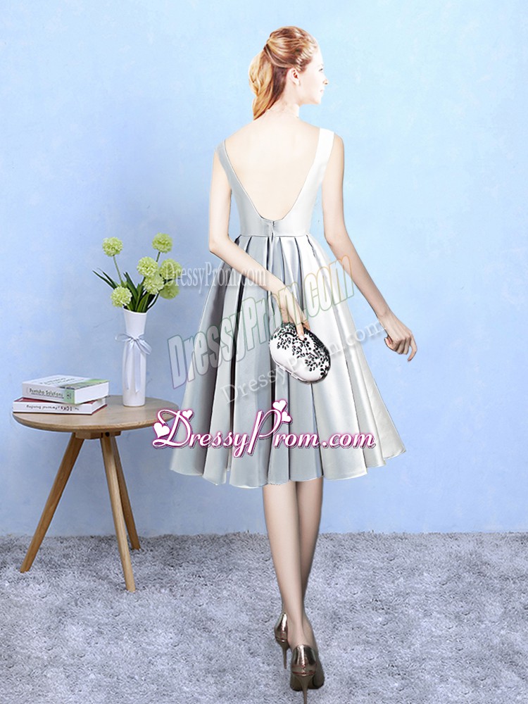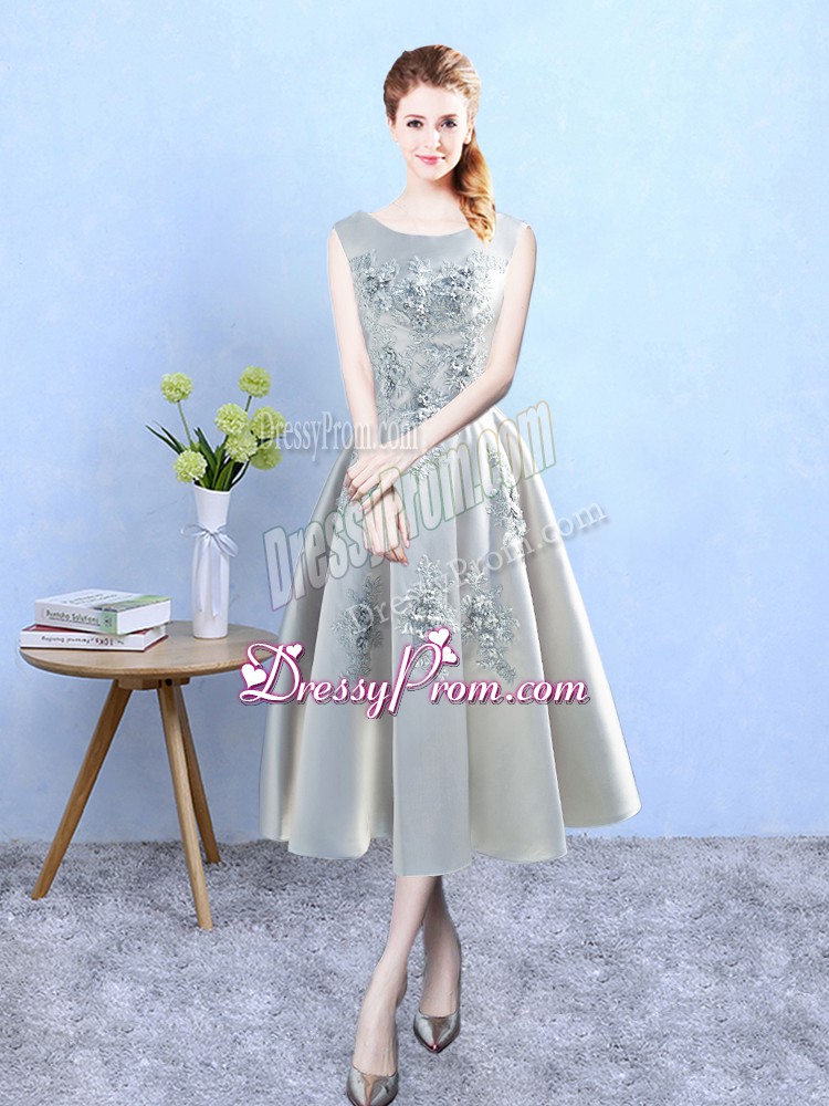 Neckline : ScoopShown Color : SilverSilhouette : A-lineSleeve Length : sleevelessHemline : tea lengthBack Detail : BacklessFabric : SatinEmbellishment : AppliquesOccasion : Prom,Party,Wedding PartySeason : Spring,Summer,Fall,Winter