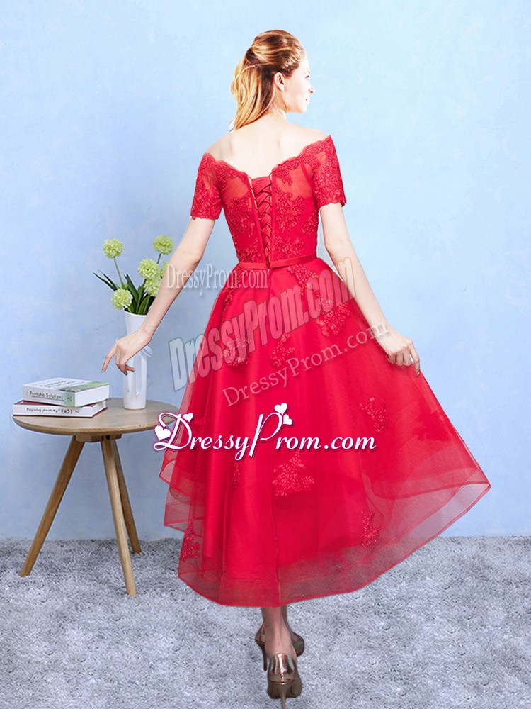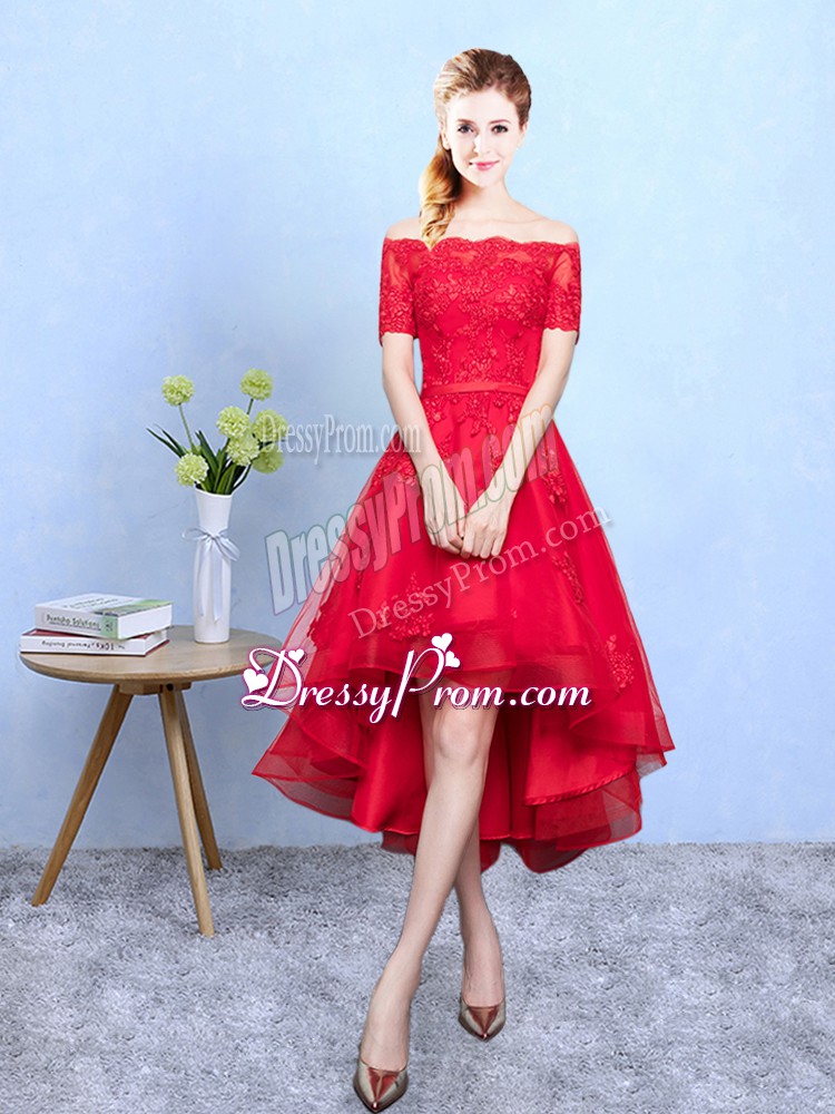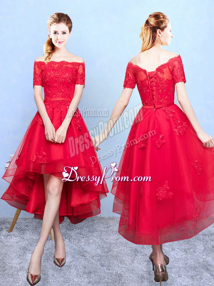 Neckline : Off the shoulder Shown Color : Wine Red Silhouette : A-line Sleeve Length : half sleeves Hemline : high low Back Detail : Lace up Fabric : Organza Embellishment : Appliques Occasion : Prom,Party Season : Spring,Summer,Fall