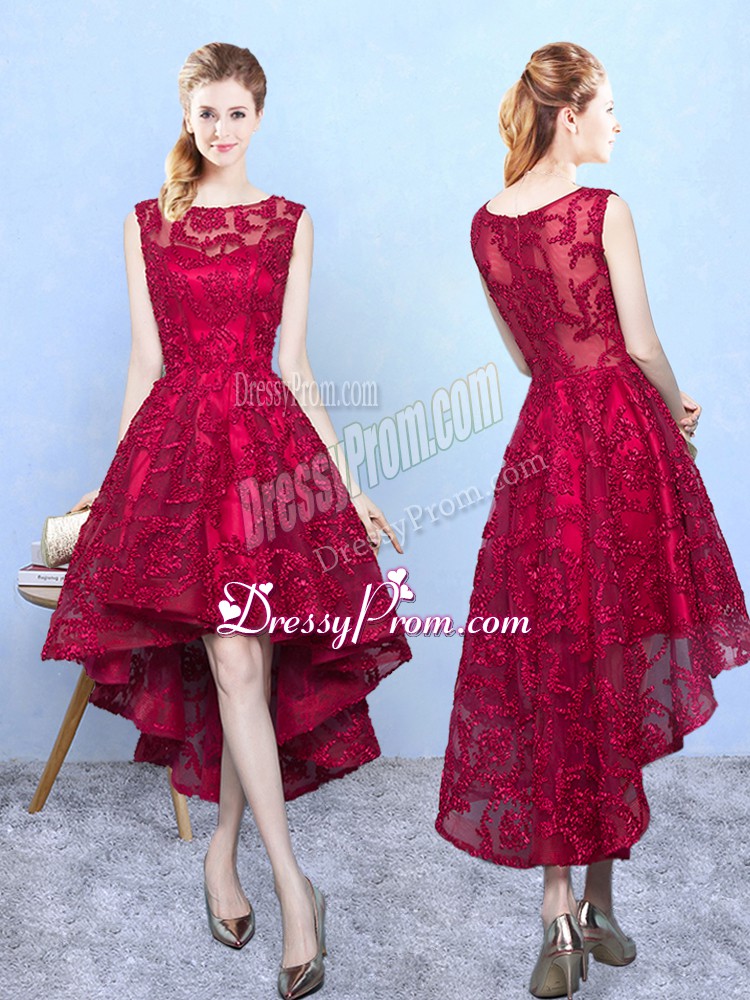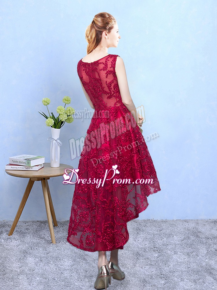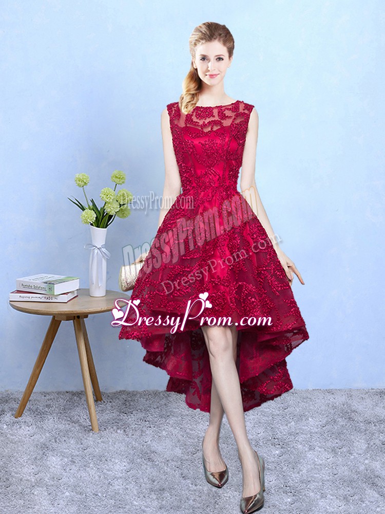 Neckline : ScoopShown Color : BurgundySilhouette : A-lineSleeve Length : sleevelessHemline : high lowBack Detail : ZipperFabric : LaceEmbellishment : LaceOccasion : Prom,Party,Wedding PartySeason : Spring,Summer,Fall,Winter