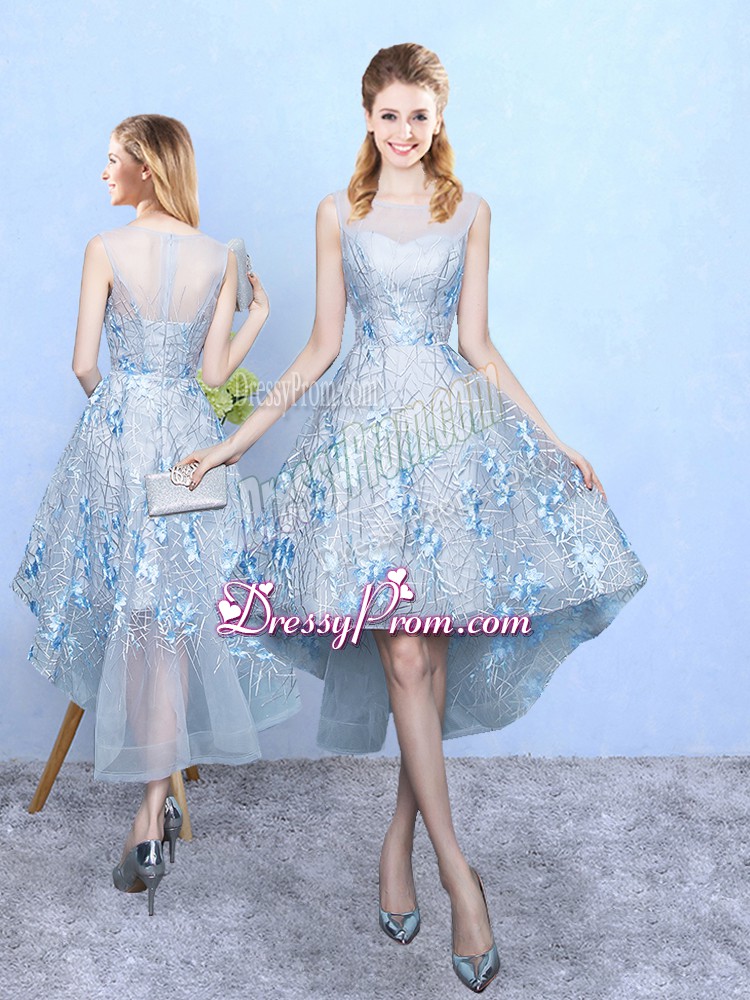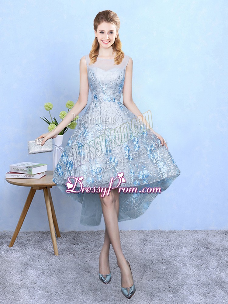 Neckline : ScoopShown Color : Light BlueSilhouette : A-lineSleeve Length : sleevelessHemline : high lowBack Detail : ZipperFabric : Tulle,PrintedEmbellishment : AppliquesOccasion : Prom,PartySeason : Spring,Summer,Fall