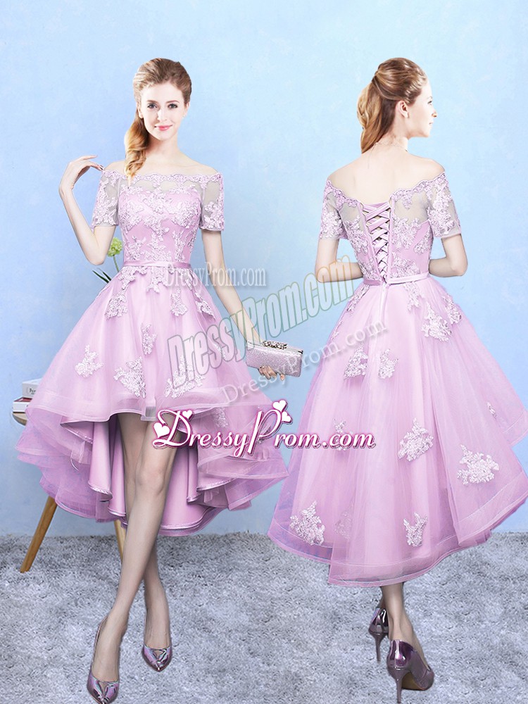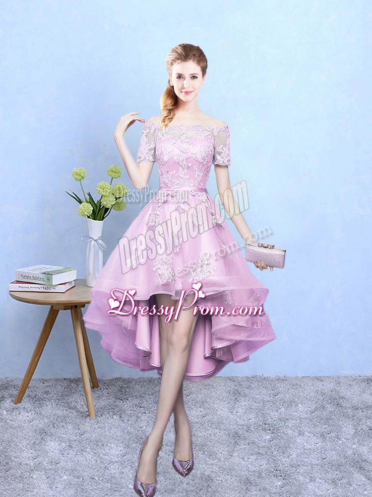 Exquisite A-line Quinceanera Court of Honor Dress Rose Pink Off The Shoulder Tulle Short Sleeves High Low Lace Up