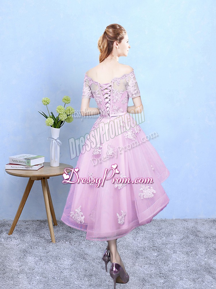 Neckline : Off the shoulder Shown Color : Rose Pink Silhouette : A-line Sleeve Length : short sleeves Hemline : high low Back Detail : Lace up Fabric : Tulle Embellishment : Lace Occasion : Prom,Party,Wedding Party Season : Spring,Summer,Fall
