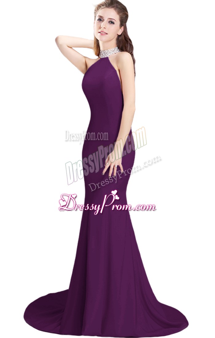 Neckline : Halter topShown Color : PurpleSilhouette : MermaidSleeve Length : sleevelessBack Detail : Side zipperFabric : Elastic Woven SatinEmbellishment : BeadingOccasion : Prom,PartySeason : Spring,Summer,Fall,Winter