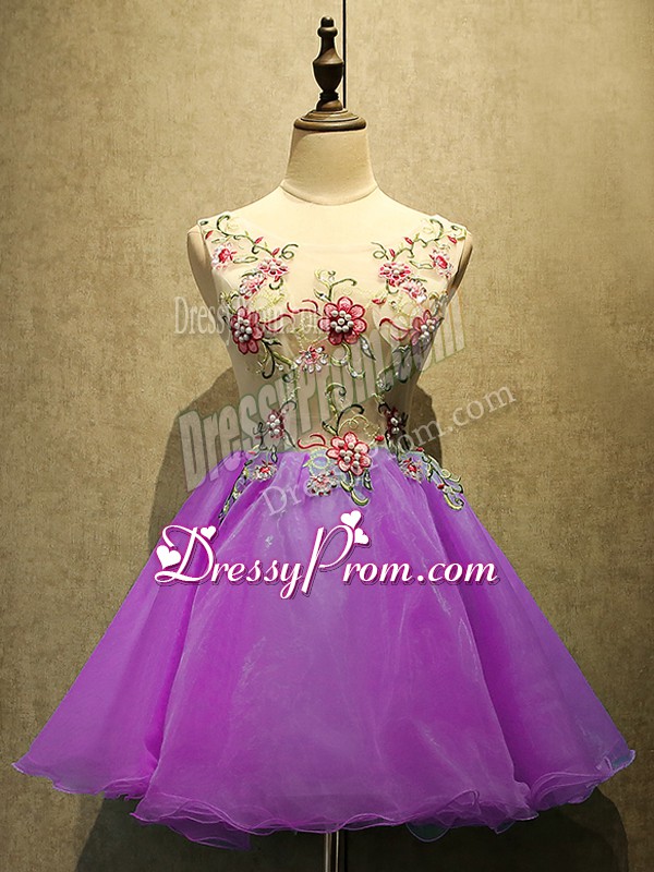 Neckline : ScoopShown Color : PurpleSilhouette : A-lineSleeve Length : sleevelessHemline : mini lengthBack Detail : Lace upFabric : OrganzaEmbellishment : EmbroideryOccasion : Prom,PartySeason : Spring,Summer,Fall