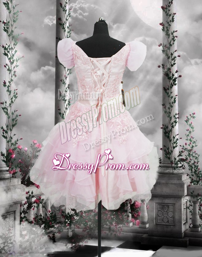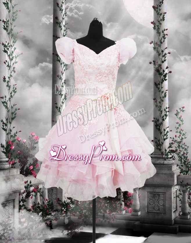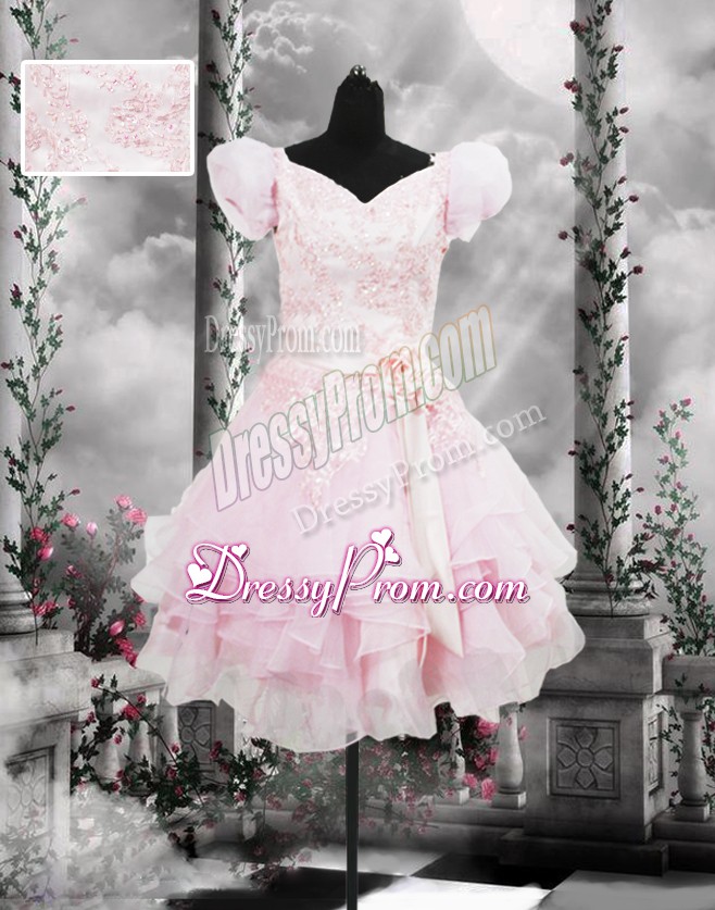 Clearance Baby Pink Organza Lace Up V-neck Short Sleeves Knee Length Homecoming Dress Beading and Appliques and Ruffles and Hand Made Flower