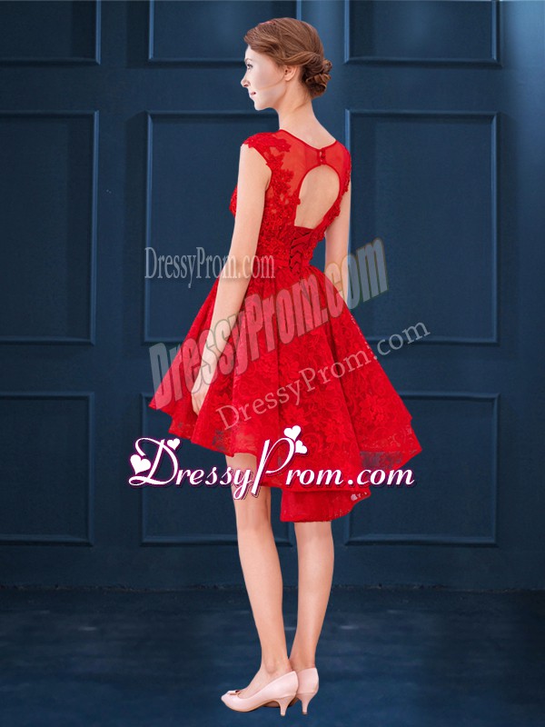 Neckline : ScoopShown Color : BlueSilhouette : A-lineSleeve Length : sleevelessHemline : high lowBack Detail : Clasp handleFabric : Satin,LaceEmbellishment : Lace,BeltOccasion : Prom,Party,Wedding PartySeason : Spring,Summer,Fall