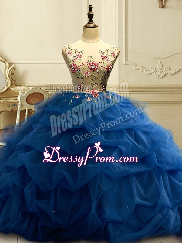 Neckline : ScoopShown Color : Navy BlueSilhouette : Ball GownsSleeve Length : sleevelessHemline : floor lengthBack Detail : Lace upFabric : OrganzaEmbellishment : Appliques,Ruffles,SequinsOccasion : Military Ball,Sweet 16,QuinceaneraSeason : Spring,Summer,Fall,Winter