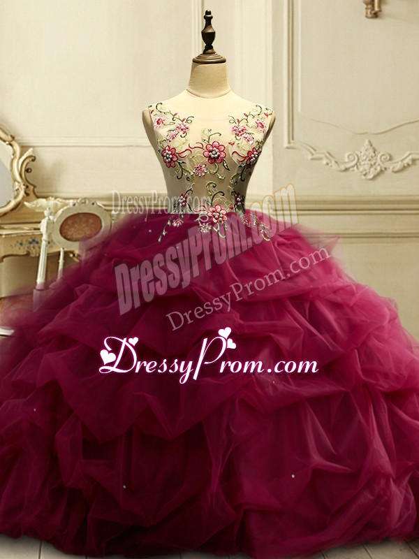 Neckline : ScoopShown Color : BurgundySilhouette : Ball GownsSleeve Length : sleevelessHemline : floor lengthBack Detail : Lace upFabric : OrganzaEmbellishment : Appliques,Ruffles,SequinsOccasion : Military Ball,Sweet 16,QuinceaneraSeason : Spring,Summer,Fall,Winter
