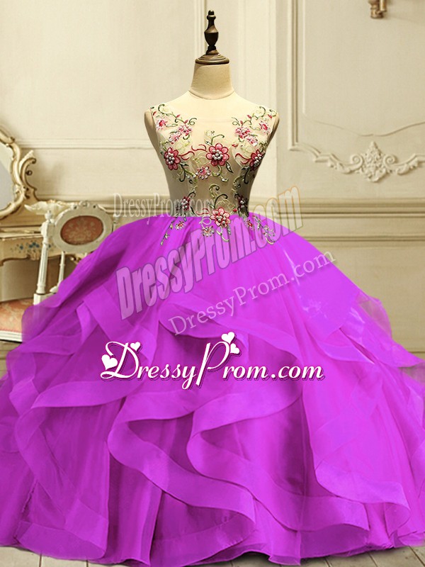 Neckline : ScoopShown Color : FuchsiaSilhouette : Ball GownsSleeve Length : sleevelessHemline : floor lengthBack Detail : Lace upFabric : OrganzaEmbellishment : Appliques,RufflesOccasion : Military Ball,Sweet 16,QuinceaneraSeason : Spring,Summer,Fall,Winter