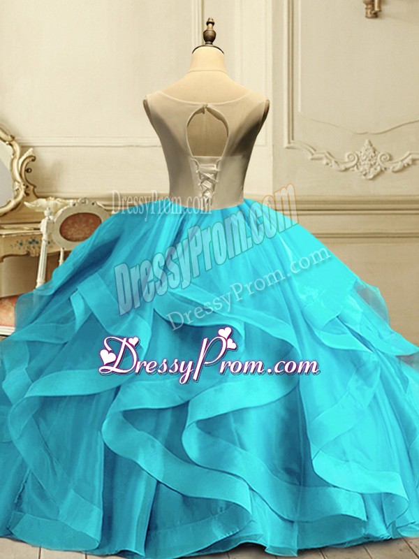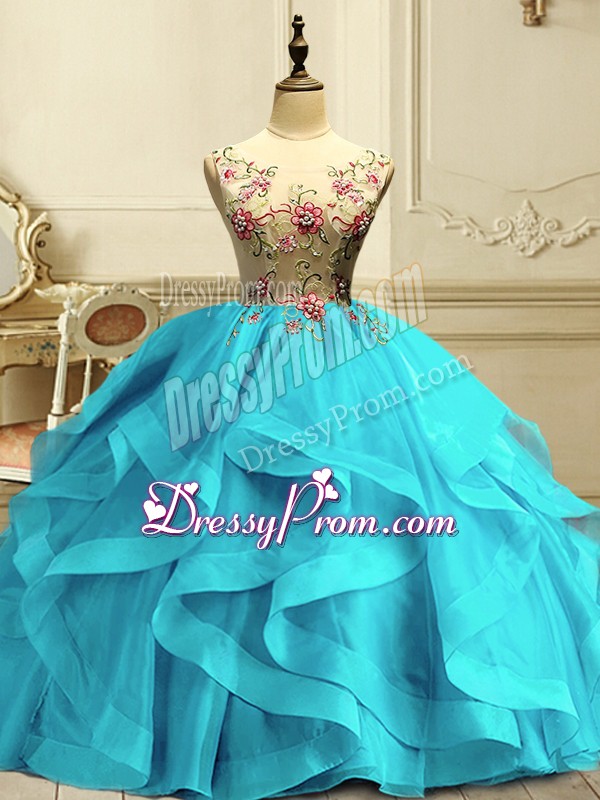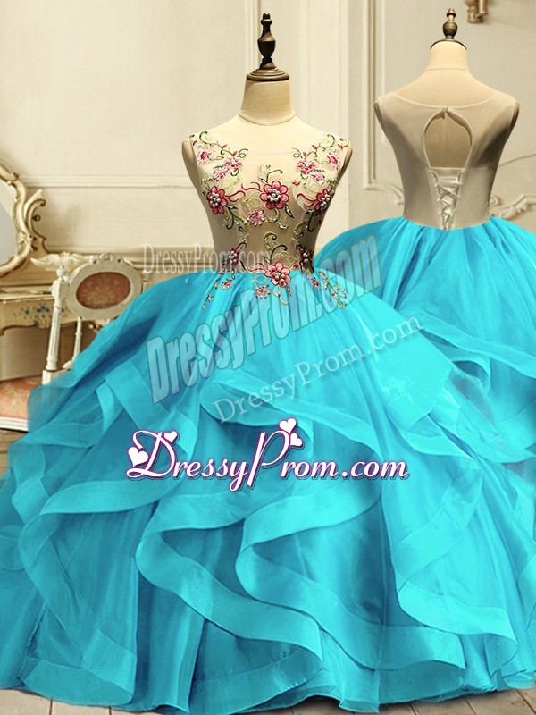 Neckline : ScoopShown Color : Aqua BlueSilhouette : Ball GownsSleeve Length : sleevelessHemline : floor lengthBack Detail : Lace upFabric : OrganzaEmbellishment : Appliques,RufflesOccasion : Military Ball,QuinceaneraSeason : Spring,Summer,Fall,Winter