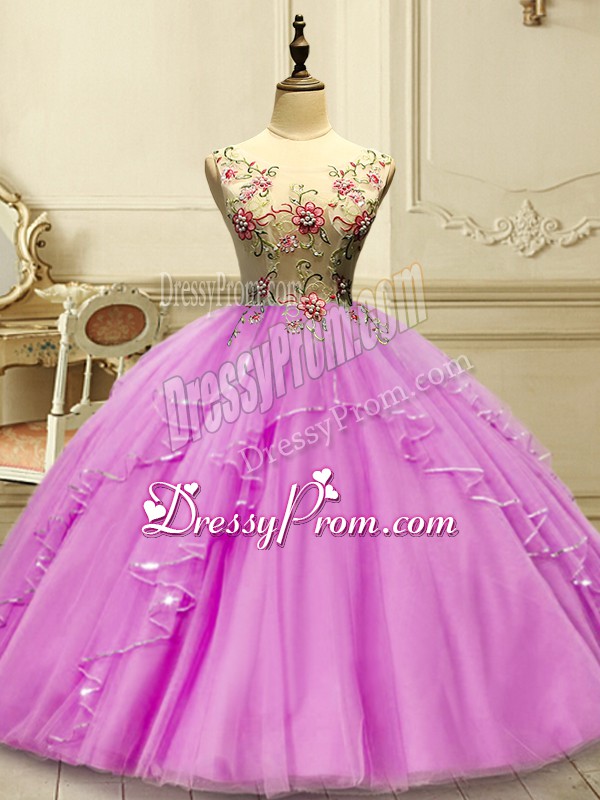 Neckline : ScoopShown Color : LilacSilhouette : Ball GownsSleeve Length : sleevelessHemline : floor lengthBack Detail : Lace upFabric : TulleEmbellishment : AppliquesOccasion : Military Ball,Sweet 16,QuinceaneraSeason : Spring,Summer,Fall,Winter