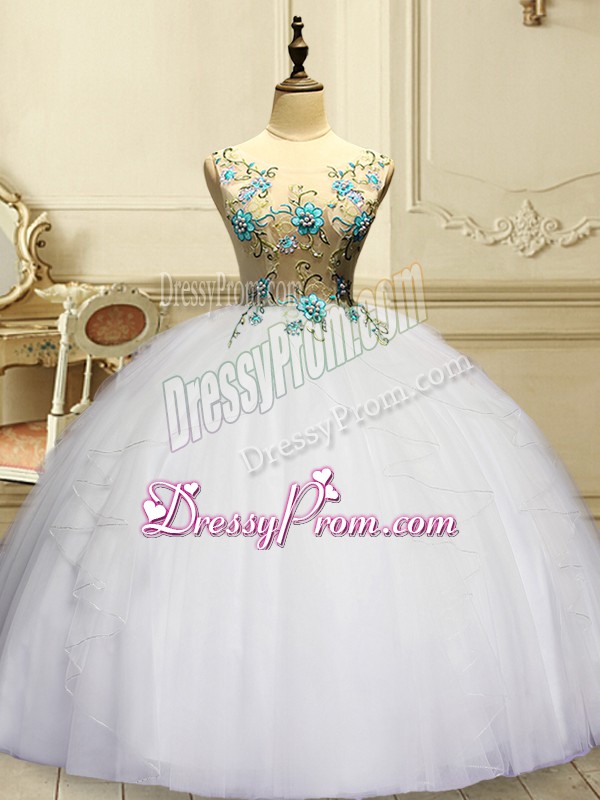 White Ball Gowns Organza Scoop Sleeveless Appliques and Ruffles Floor Length Lace Up Quinceanera Gown