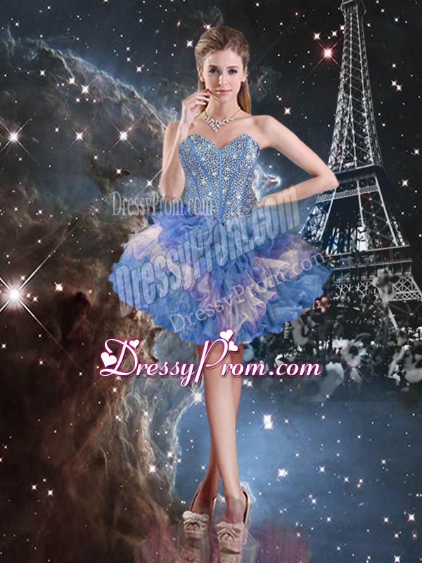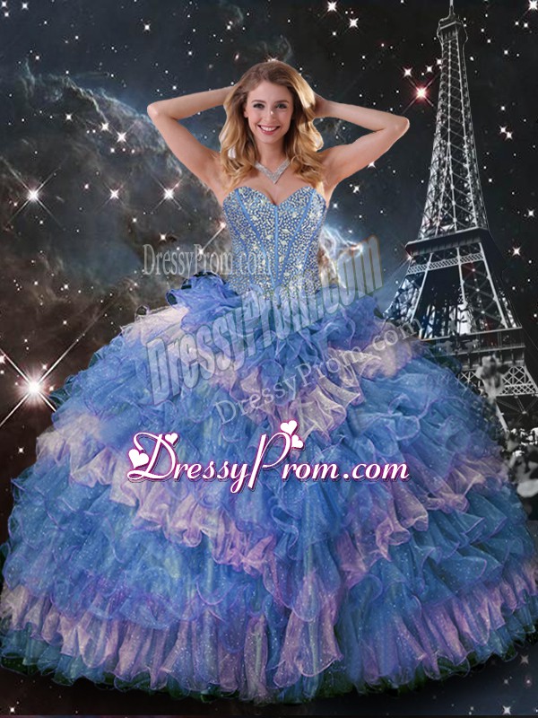Neckline : SweetheartShown Color : Multi-colorSilhouette : Ball GownsSleeve Length : sleevelessHemline : floor lengthBack Detail : Lace upFabric : OrganzaEmbellishment : Beading,Ruffled Layers,SequinsOccasion : Military Ball,Sweet 16,QuinceaneraSeason : Spring,Summer,Fall,Winter