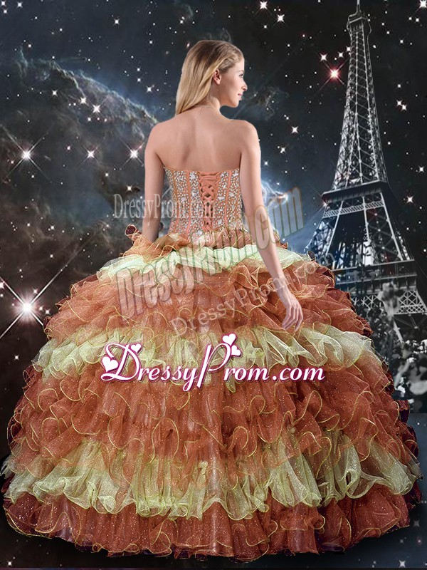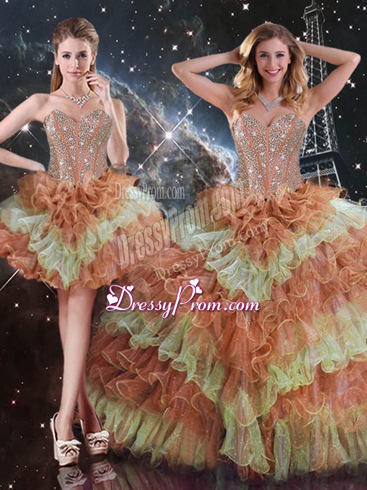Neckline : SweetheartShown Color : Multi-colorSilhouette : Three PiecesSleeve Length : sleevelessHemline : floor lengthBack Detail : Lace upFabric : OrganzaEmbellishment : Beading,Ruffled LayersOccasion : Military Ball,Sweet 16,QuinceaneraSeason : Spring,Summer,Fall,Winter