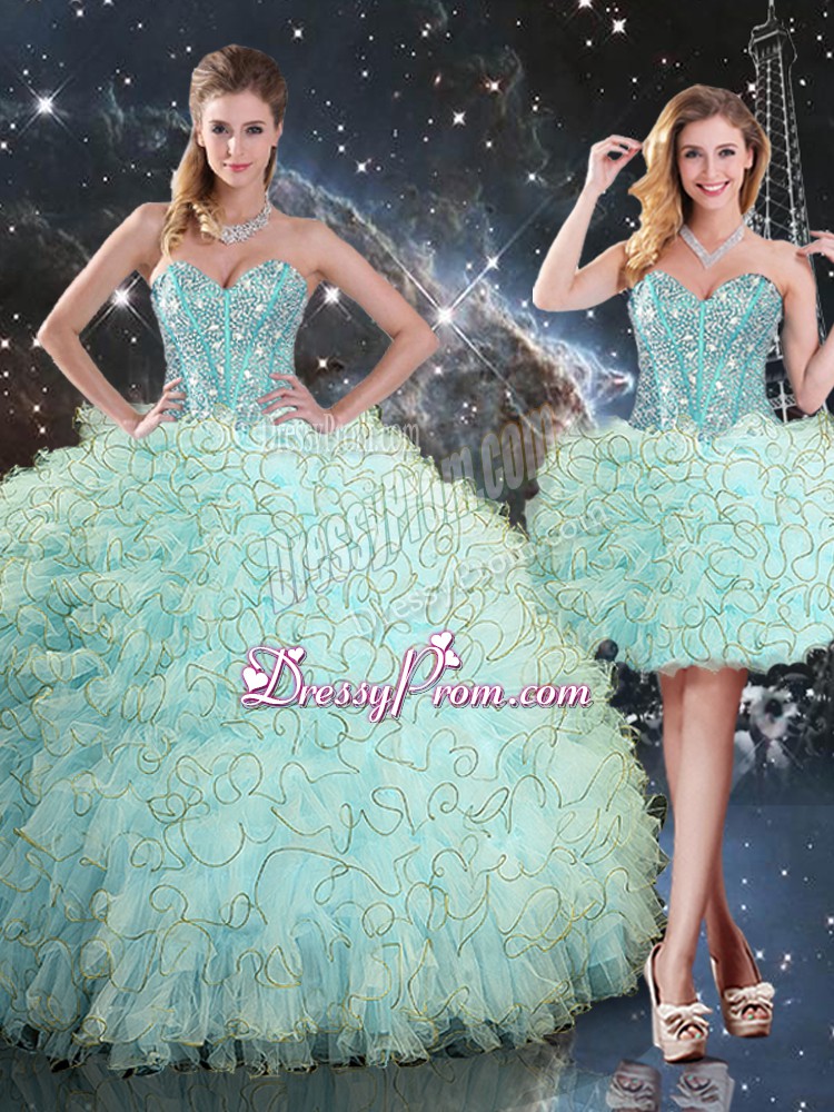 Neckline : SweetheartShown Color : TurquoiseSilhouette : Ball GownsSleeve Length : sleevelessHemline : floor lengthBack Detail : Lace upFabric : OrganzaEmbellishment : Beading,RufflesOccasion : Military Ball,Sweet 16,QuinceaneraSeason : Spring,Summer,Fall,Winter