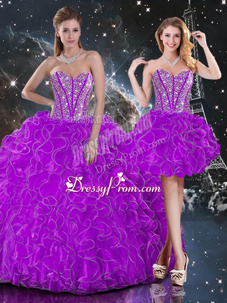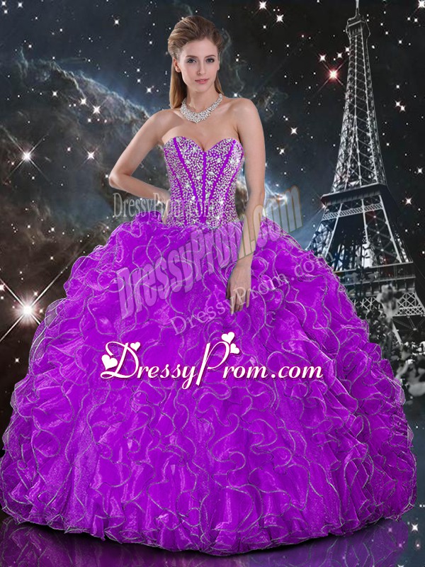 Free and Easy Purple Ball Gowns Organza Sweetheart Sleeveless Beading and Ruffles Floor Length Lace Up 15th Birthday Dress
