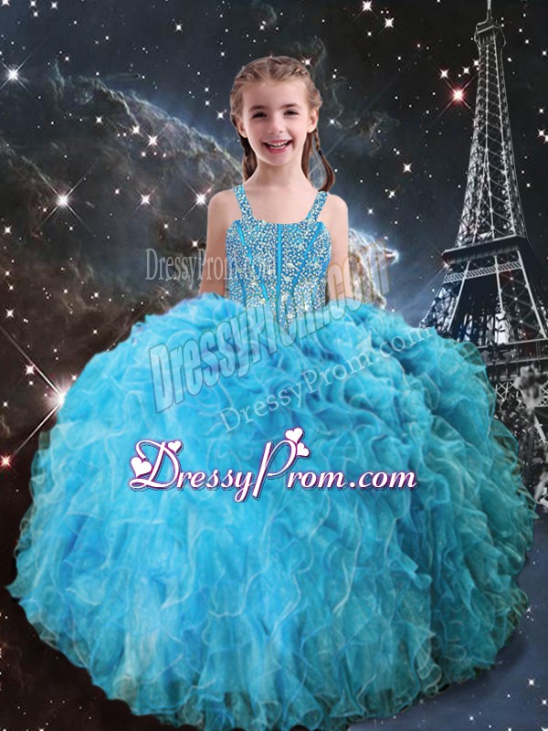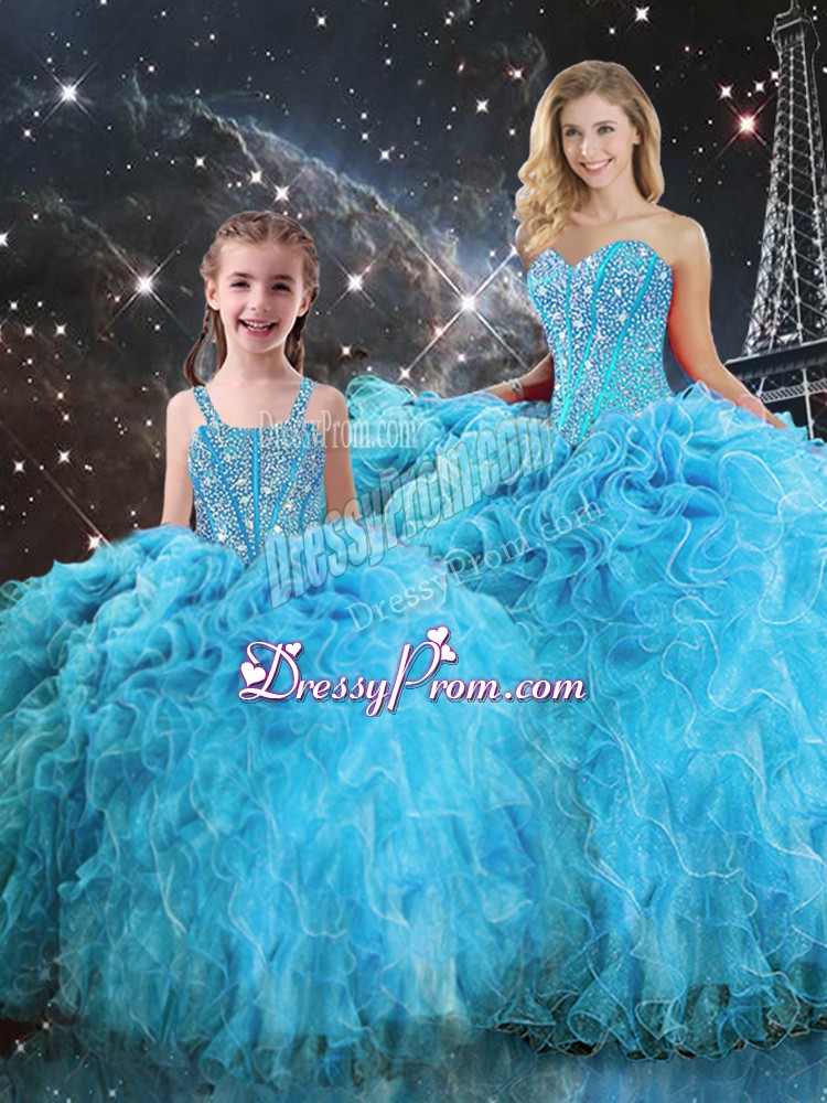 Attractive Aqua Blue Sleeveless Floor Length Beading and Ruffles Lace Up Ball Gown Prom Dress