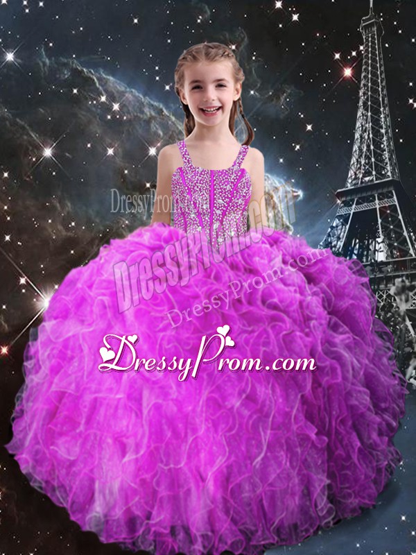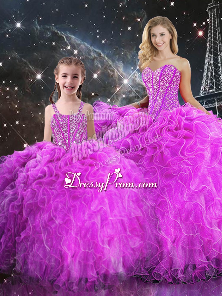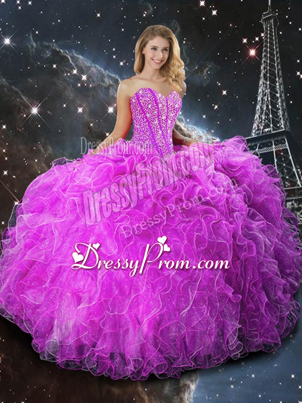 Glittering Floor Length Fuchsia Quinceanera Dresses Organza Sleeveless Beading and Ruffles