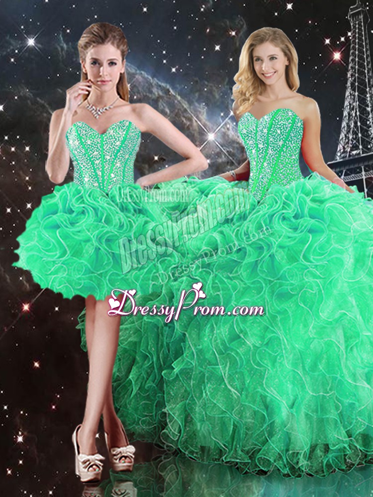 Sleeveless Organza Floor Length Lace Up Quinceanera Dresses in Green with Beading and Ruffles