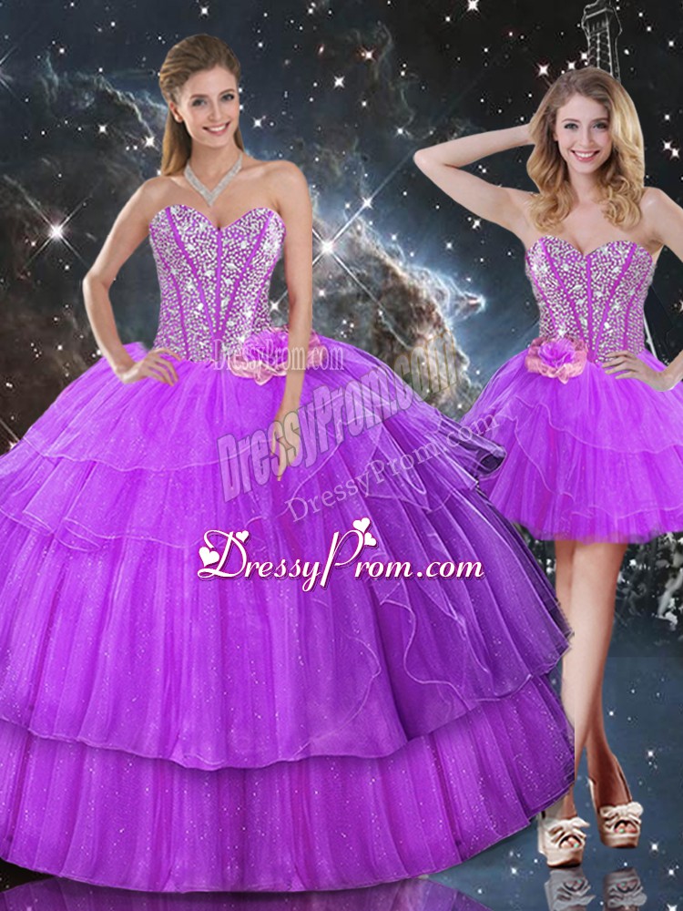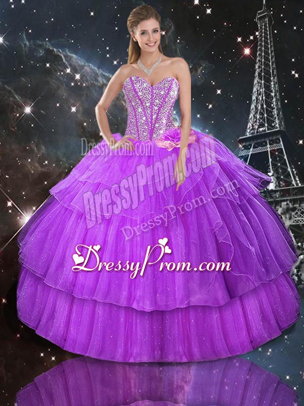 Neckline : SweetheartShown Color : PurpleSilhouette : Ball GownsSleeve Length : sleevelessHemline : floor lengthBack Detail : Lace upFabric : OrganzaEmbellishment : Ruffled LayersOccasion : Military Ball,Sweet 16,QuinceaneraSeason : Spring,Summer,Fall,Winter