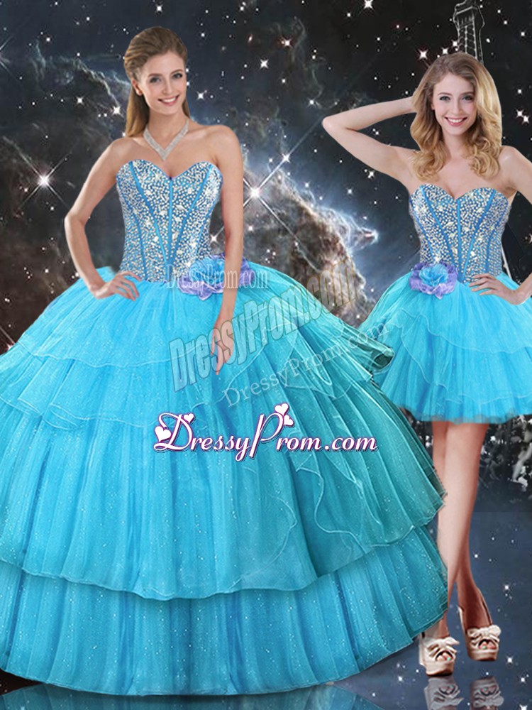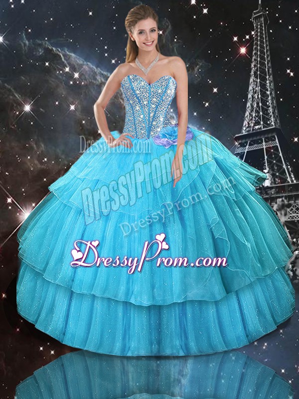 Neckline : SweetheartShown Color : Aqua BlueSilhouette : Ball GownsSleeve Length : sleevelessHemline : floor lengthBack Detail : Lace upFabric : OrganzaEmbellishment : Ruffled Layers,SequinsOccasion : Military Ball,Sweet 16,QuinceaneraSeason : Spring,Summer,Fall,Winter