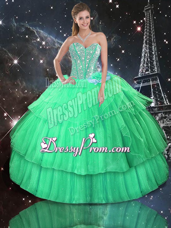 Neckline : SweetheartShown Color : Apple GreenSilhouette : Ball GownsSleeve Length : sleevelessHemline : floor lengthBack Detail : Lace upFabric : OrganzaEmbellishment : Ruffled Layers,SequinsOccasion : Military Ball,Sweet 16,QuinceaneraSeason : Spring,Summer,Fall,Winter