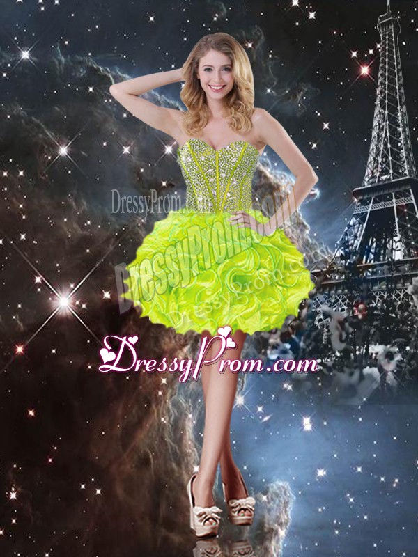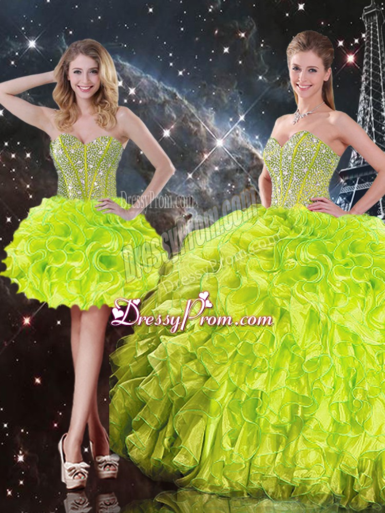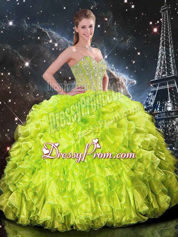 Neckline : SweetheartShown Color : Yellow GreenSilhouette : Ball GownsSleeve Length : sleevelessHemline : floor lengthBack Detail : Lace upFabric : OrganzaEmbellishment : Beading,RufflesOccasion : Military Ball,Sweet 16,QuinceaneraSeason : Spring,Summer,Fall,Winter