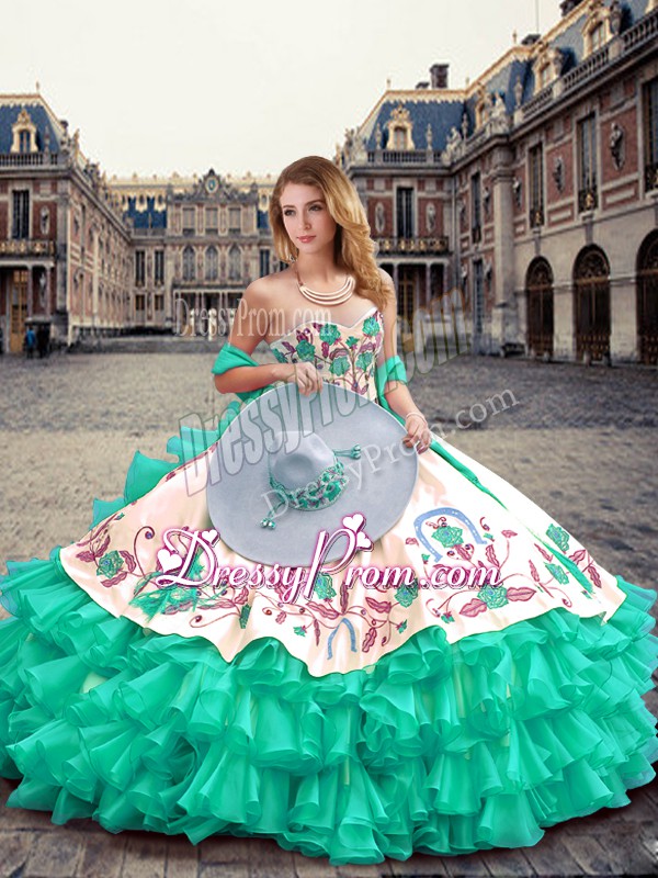 Neckline : SweetheartShown Color : TurquoiseSilhouette : Ball GownsSleeve Length : sleevelessHemline : floor lengthBack Detail : Lace upFabric : OrganzaEmbellishment : Embroidery,Ruffled LayersOccasion : Military Ball,Sweet 16,QuinceaneraSeason : Spring,Summer,Fall,Winter