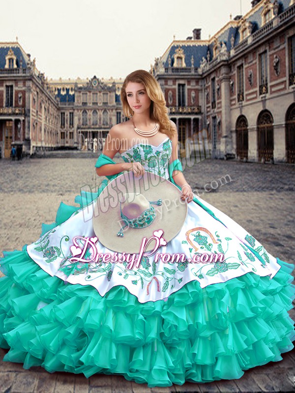 Neckline : SweetheartShown Color : TurquoiseSilhouette : Ball GownsSleeve Length : sleevelessHemline : floor lengthBack Detail : Lace upFabric : Organza,TaffetaEmbellishment : Embroidery,Ruffled LayersOccasion : Military Ball,Sweet 16,QuinceaneraSeason : Spring,Summer,Fall,Winter