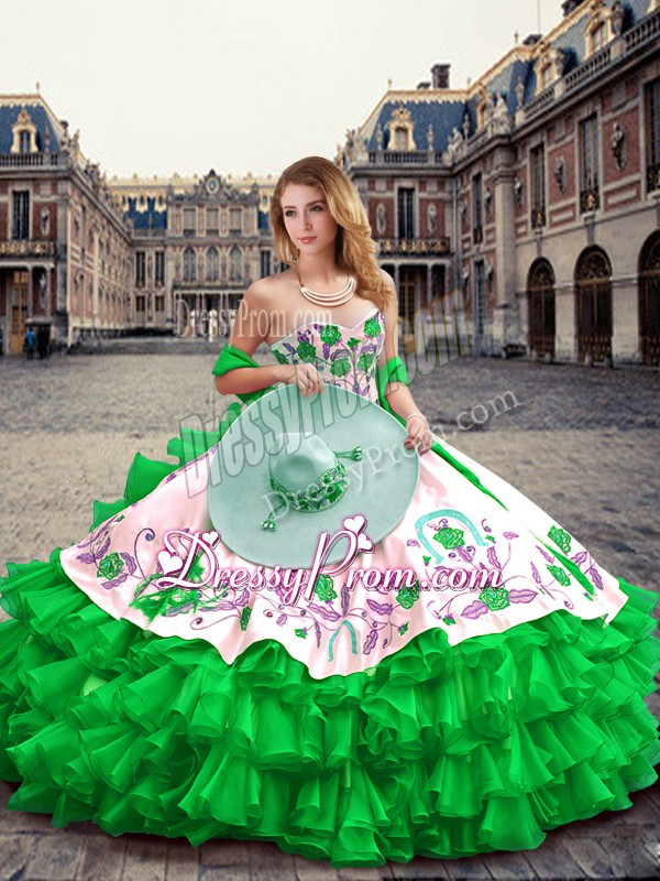 Neckline : SweetheartShown Color : GreenSilhouette : Ball GownsSleeve Length : sleevelessHemline : floor lengthBack Detail : Lace upFabric : Organza,TaffetaEmbellishment : Embroidery,Ruffled LayersOccasion : Military Ball,Sweet 16,QuinceaneraSeason : Spring,Summer,Fall,Winter