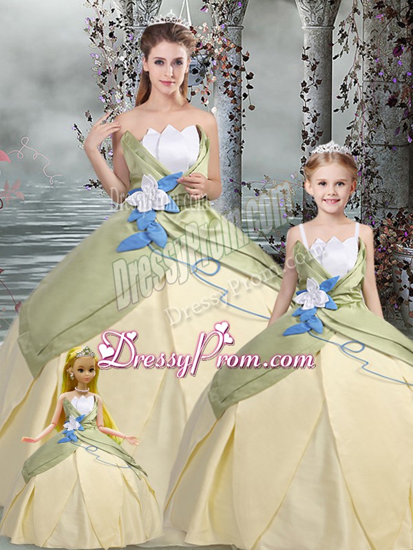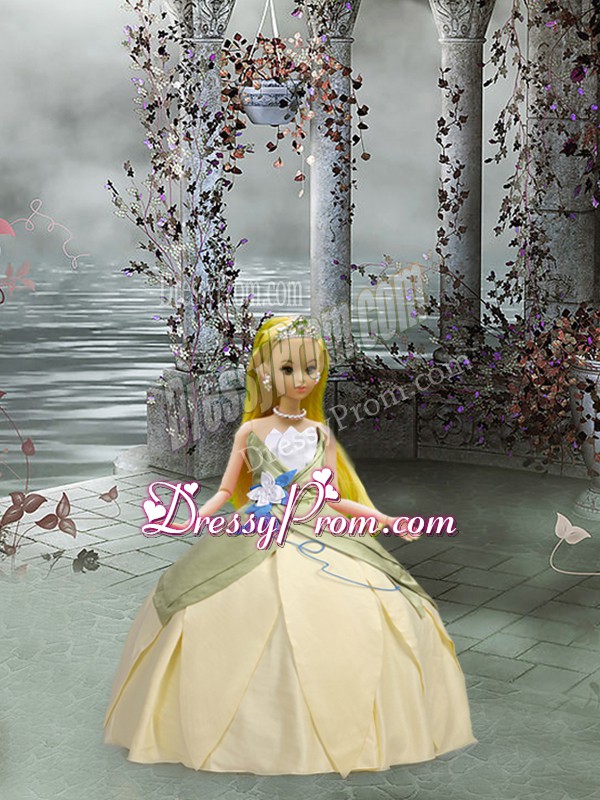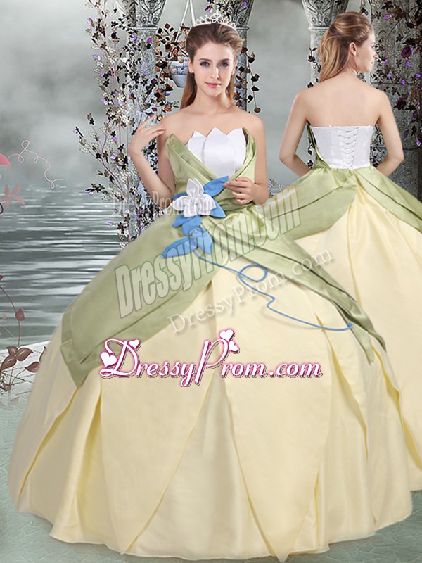 Neckline : ScallopedShown Color : ChampagneSilhouette : Ball GownsSleeve Length : sleevelessHemline : floor lengthBack Detail : Lace upFabric : TaffetaEmbellishment : Ruching,Hand Made FlowerOccasion : Military Ball,Sweet 16,QuinceaneraSeason : Spring,Summer,Fall,Winter
