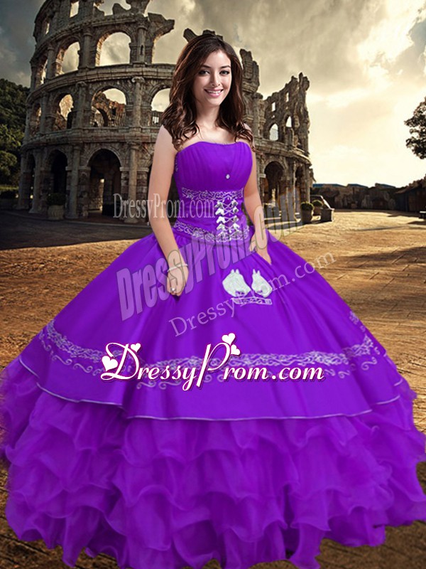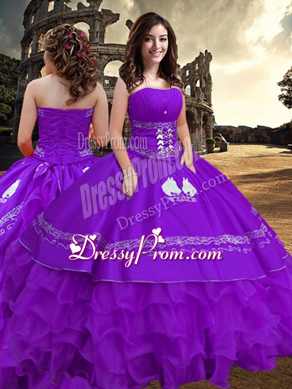 Neckline : StraplessShown Color : PurpleSilhouette : Ball GownsSleeve Length : sleevelessHemline : floor lengthBack Detail : ZipperFabric : TaffetaEmbellishment : Embroidery,Ruffled LayersOccasion : Military Ball,Sweet 16,QuinceaneraSeason : Spring,Summer,Fall,Winter