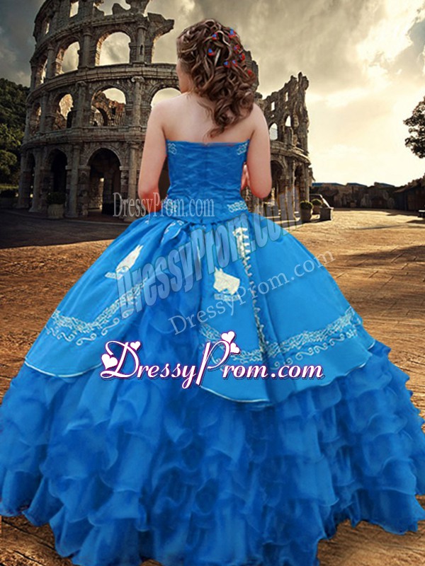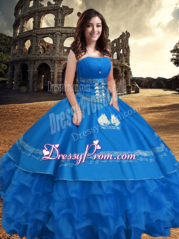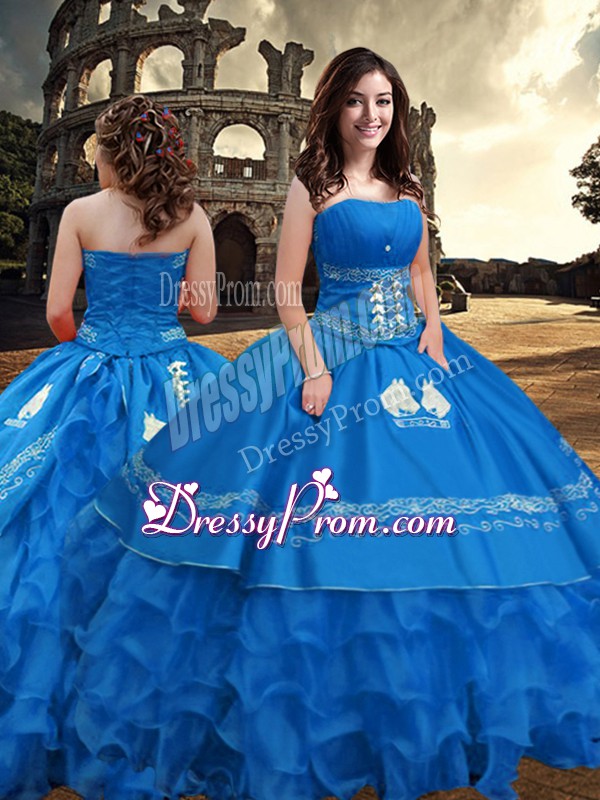 Neckline : StraplessShown Color : BlueSilhouette : Ball GownsSleeve Length : sleevelessHemline : floor lengthBack Detail : ZipperFabric : TaffetaEmbellishment : Embroidery,Ruffled LayersOccasion : Military Ball,Sweet 16,QuinceaneraSeason : Spring,Summer,Fall,Winter