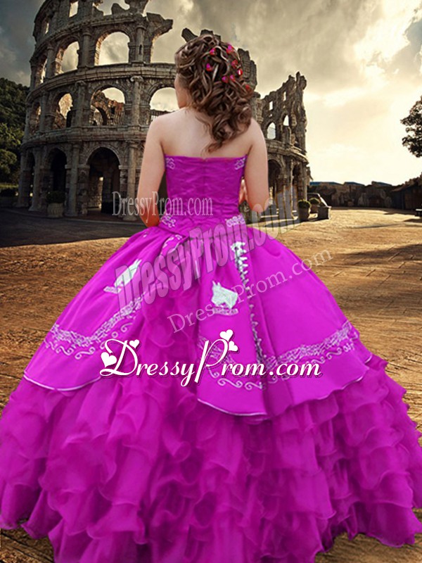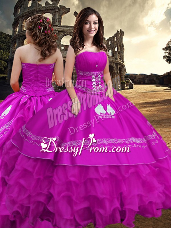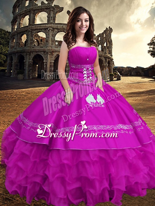 Neckline : StraplessShown Color : FuchsiaSilhouette : Ball GownsSleeve Length : sleevelessHemline : floor lengthBack Detail : ZipperFabric : TaffetaEmbellishment : Embroidery,Ruffled LayersOccasion : Military Ball,Sweet 16,QuinceaneraSeason : Spring,Summer,Fall,Winter