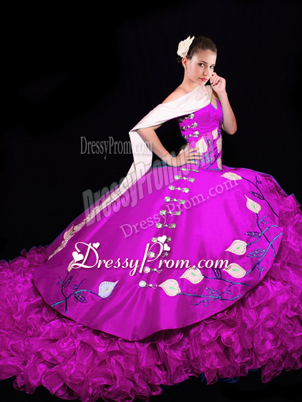 Vintage Taffeta Sleeveless Quinceanera Dress Brush Train and Embroidery and Ruffles