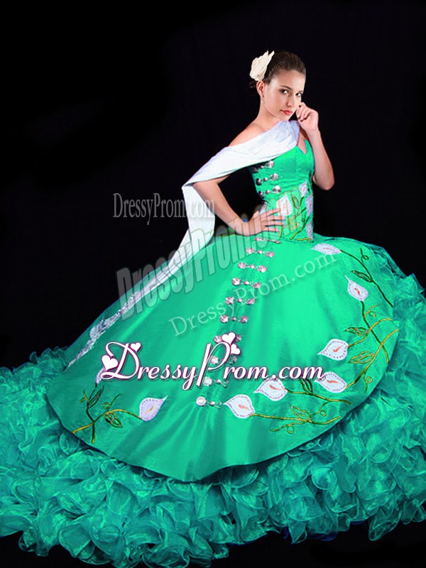 Neckline : SweetheartShown Color : TurquoiseSilhouette : Ball GownsSleeve Length : sleevelessBack Detail : Lace upFabric : OrganzaEmbellishment : Embroidery,RufflesOccasion : Military Ball,Sweet 16,QuinceaneraSeason : Spring,Summer,Fall,Winter