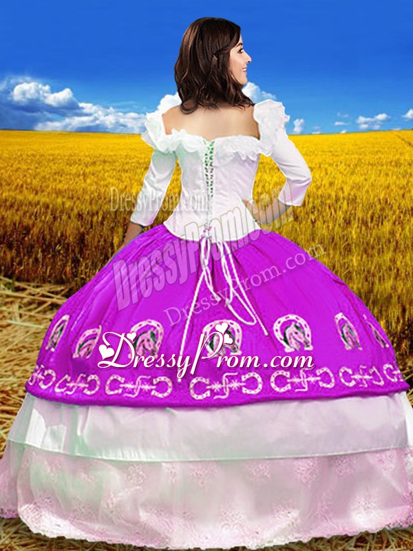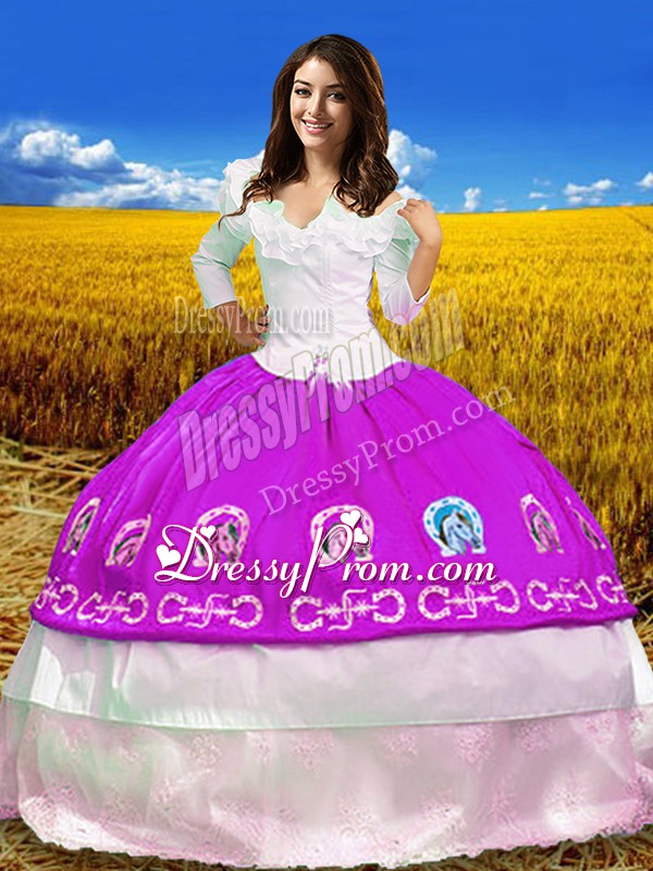 Neckline : Off the shoulderShown Color : FuchsiaSilhouette : Ball GownsSleeve Length : 3|4 length sleeveHemline : floor lengthBack Detail : Lace upFabric : TaffetaEmbellishment : EmbroideryOccasion : Military Ball,Sweet 16,QuinceaneraSeason : Spring,Summer,Fall,Winter