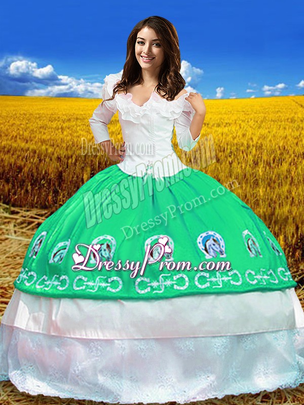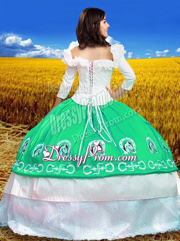 Neckline : Off the shoulderShown Color : TurquoiseSilhouette : Ball GownsSleeve Length : 3|4 length sleeveHemline : floor lengthBack Detail : Lace upFabric : TaffetaEmbellishment : EmbroideryOccasion : Military Ball,Sweet 16,QuinceaneraSeason : Spring,Summer,Fall,Winter