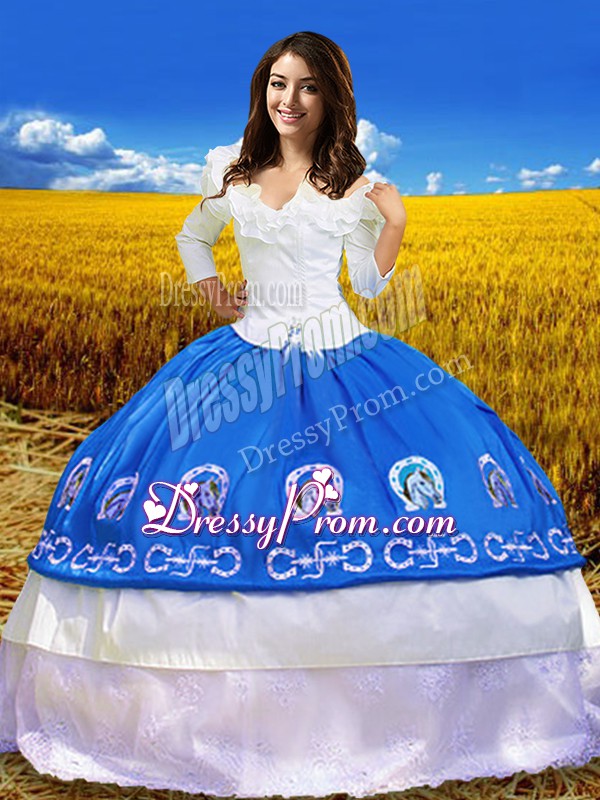 Neckline : Off the shoulderShown Color : BlueSilhouette : Ball GownsSleeve Length : 3|4 length sleeveHemline : floor lengthBack Detail : Lace upFabric : TaffetaEmbellishment : EmbroideryOccasion : Military Ball,Sweet 16,QuinceaneraSeason : Spring,Summer,Fall,Winter
